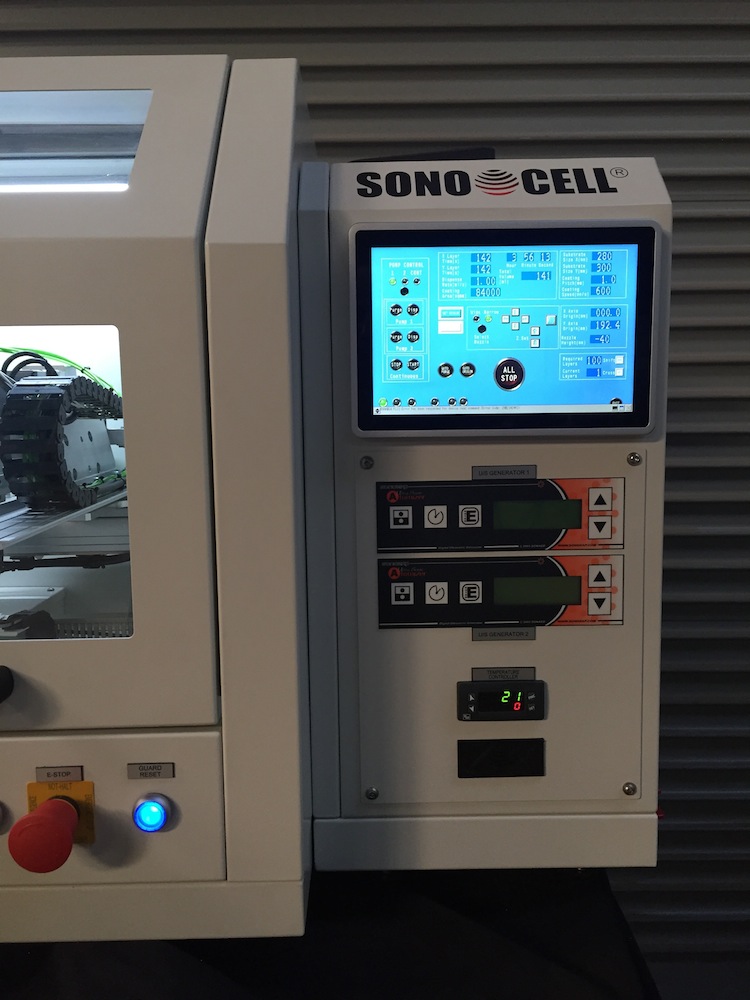 SONO-CELL ® Ultrasonic spray coating system includes XYZ motion system, Sonaer ultrasonic spray nozzle, ultrasonic generator, constant liquid delivery system and air control. It is suitable for nano thin film coating e.g. solar cell, fuel cell, glass coating. Maximum spray area: 500mm x 500mm…
